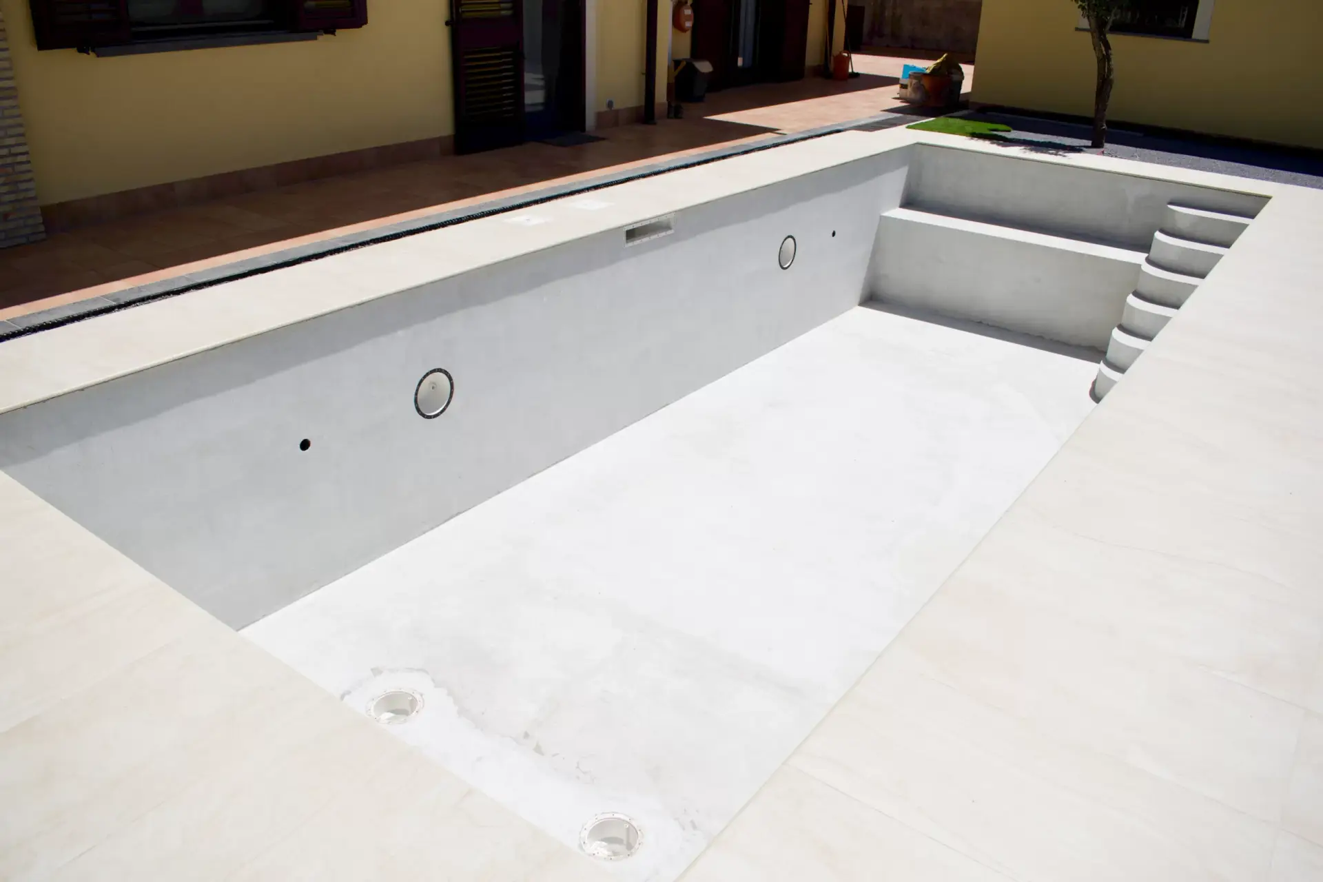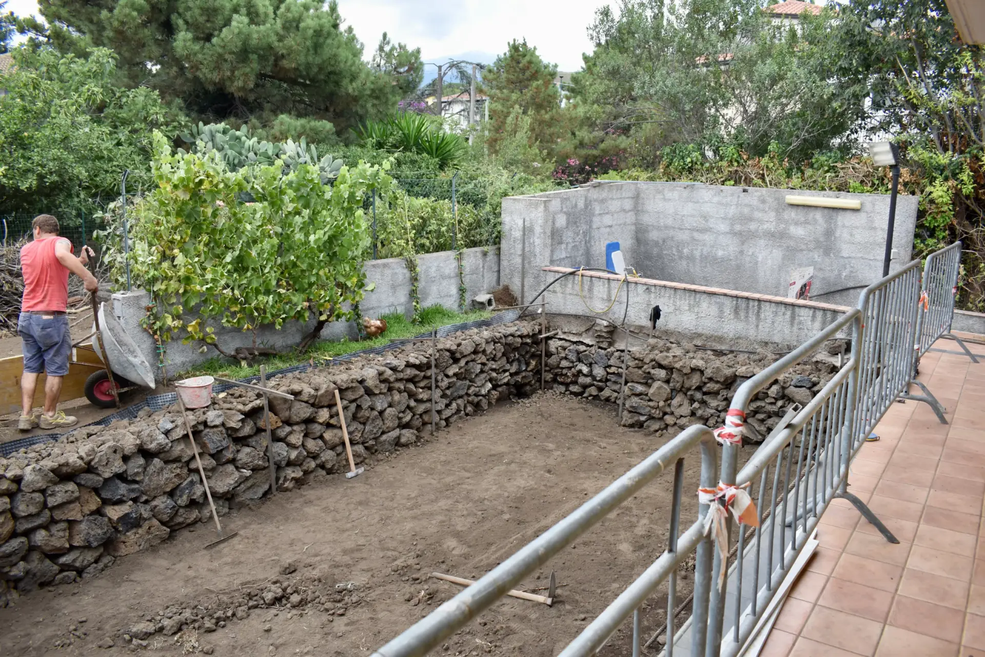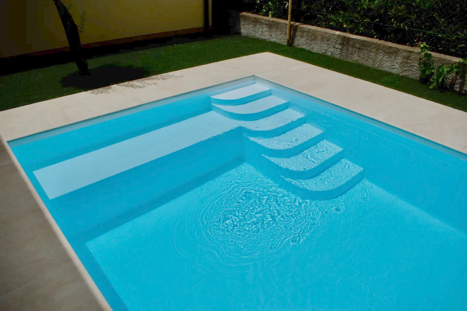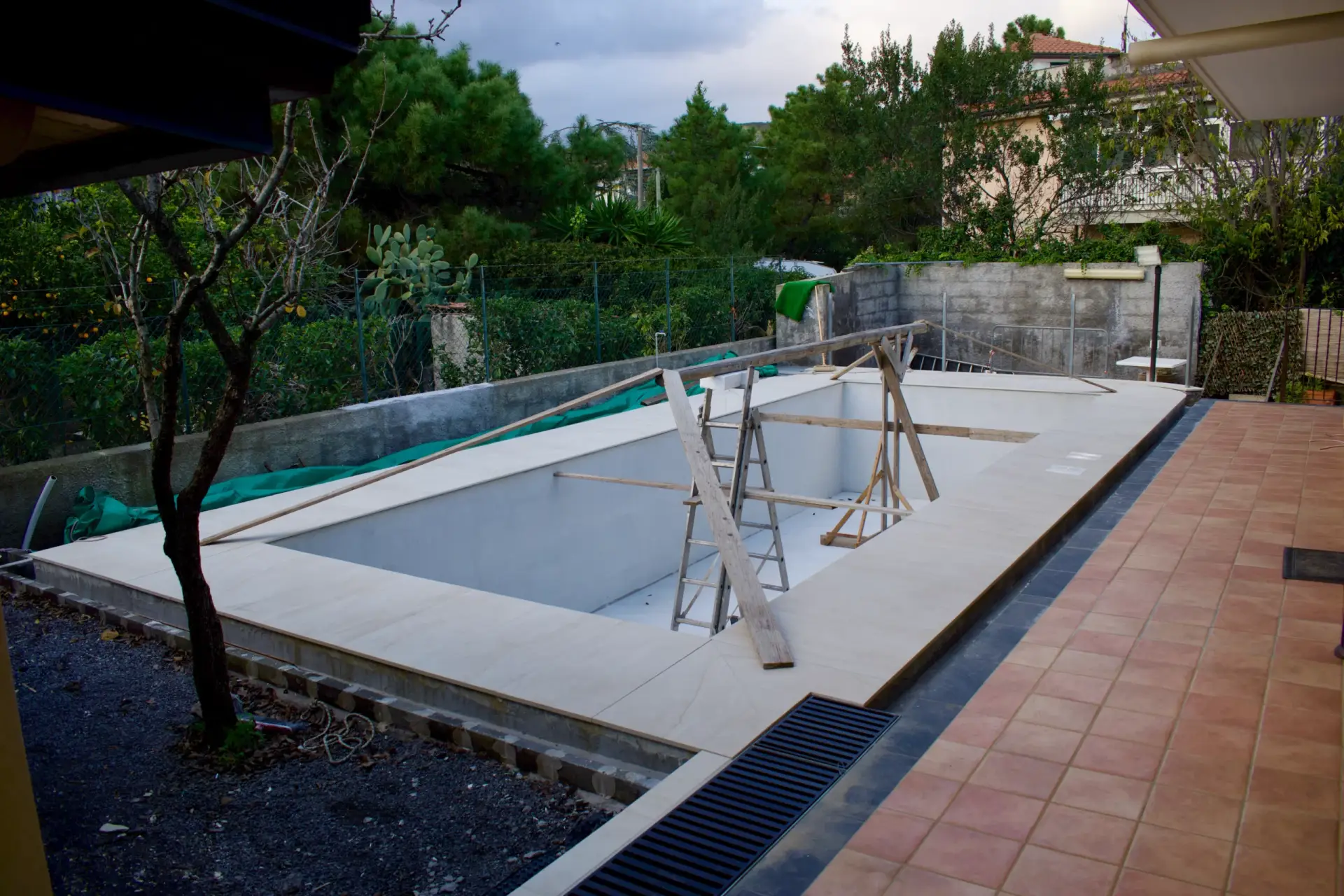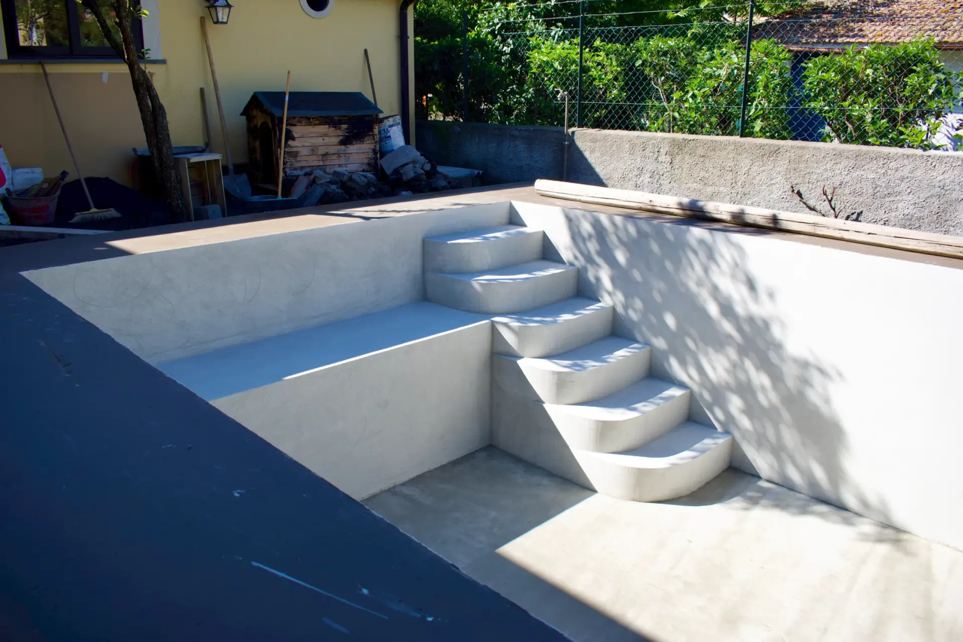 I nostri lavori Abbiamo soluzioni ad ogni esigenza Piscina interrata Dimensioni 8x3mProfondità 1.5mScala angolareSeduta sul lato cortoTelo bianco Costruzione villa singola Muro a pietra di contenimento Ristrutturazione mansarda